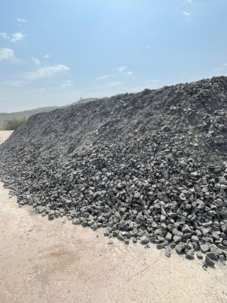 This image showcases a significant pile of chromite ore, a critical industrial minerals resource used primarily in the production of ferrochrome for stainless steel manufacturing. Chromite, with its unique properties such as corrosion resistance and high melting point, plays a vital role in various industries, from construction to chemical production. The photograph captured at our Mining Site covers the scale of chromite mining operations, highlighting the importance of this mineral in global industrial applications.